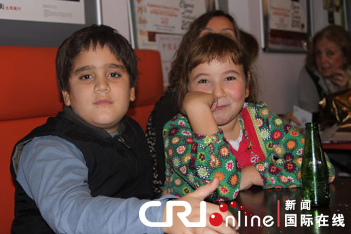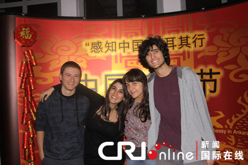 活动组织方在晚餐开始前准备了预热节目来调节气氛。第一个游戏为“心有灵犀”,两人一组进行猜谜。结果来自俄罗斯和摩尔多瓦的一对情侣拿到奖品——不锈钢制成的“福”字书夹。他们都是中技大的学生,喜欢中国文化,也很喜欢吃中餐,在安卡拉经常去中国餐馆。随后,中技大中国留学生周昕仪与孔子学院汉语班土耳其学生尹小丽用中文合唱了一首中国歌曲。尹小丽告诉记者:“我在孔子学院学习中文,我的老师给我起了这个名字。”