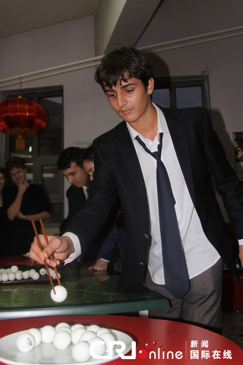 第二个游戏为夹乒乓球,用筷子把乒乓球从一个盘子夹到另一个盘子。这个游戏受到所有学生的喜爱。最终赢得冠军的是阿塔图尔克高中汉语班的埃姆雷。他两分钟内把20个乒乓球夹到另一个盘子里,令人惊讶的是他居然是第一次使用筷子。