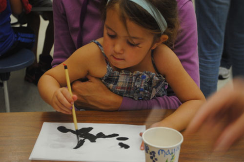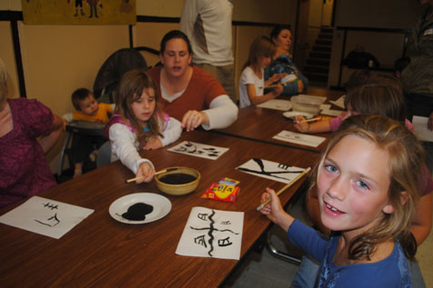 2010年10月6日晚,蒙大拿大学孔子学院与当地的LEWIS &CLARK 小学联合举办了“中秋家庭趣味之夜”活动。孔子学院的老师们与当地著名中国传统工艺家BABARA MORRISON 女士共同精心策划了此次活动。 通过学校的宣传,当晚参加活动的学生及家长人数达80余人。整个活动丰富多彩,井然有序。孔院中方院长秦洁女士通过ppt的形式,图文并茂地向大家介绍了中秋节的由来和美丽的传说。随后,Barbara女士教大家用毛笔书写“月”字,孩子们和家长们都专心致至地学习中国书法,孩子们还饶有兴趣地在宣纸画上月亮和玉兔,并在作品上兴奋地盖上孔院老师们事先准备好的印章。最热闹的是大家一起学做中秋节的传统食品——月饼。孩子仔细挑选做月饼的模子,还在烤月饼的籿纸上写上自己的名字,表明这是自己的杰作。在等待月饼出炉的间隙,朱晓华老师还教孩子们跳中国传统的长绸舞。
