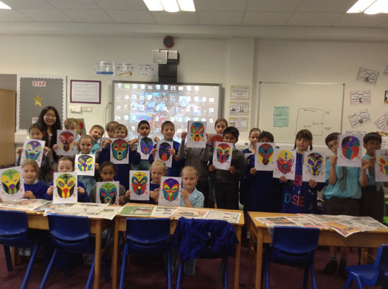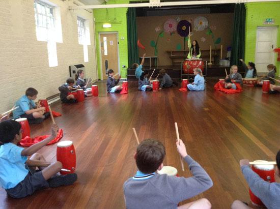 京剧脸谱活动将语言和文化融为一体,孩子们既迅速地掌握了颜色的中文名称,又了解了不同脸谱颜色的特殊含义,并设计制作了自己的脸谱。接下来的吹画环节,不用画笔,只需一根吸管和数滴墨汁,就可以吹出各样的树干树枝,用棉签点画,一幅幅生机盎然的梅花图便跃然纸上。礼堂里的中国鼓节奏鲜明,整齐划一,学生们在老师的指挥下,演奏了一段段欢快的中国民乐乐章。太极扇更是将中国日的活动推向高潮,有力地开扇合扇,整齐的白鹤亮翅,灵活的黄蜂入洞,初次接触中国武术的英国孩子学得那么认真和投入。中国汉字环节将孩子们带入了神奇而又充满魅力的汉字世界,并让他们掌握了汉字构成的要领和记忆技巧。