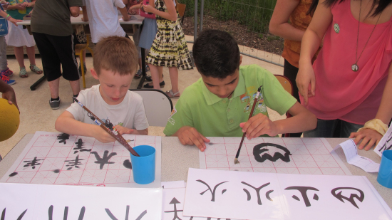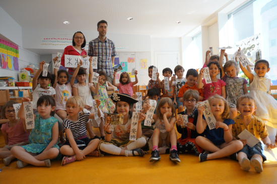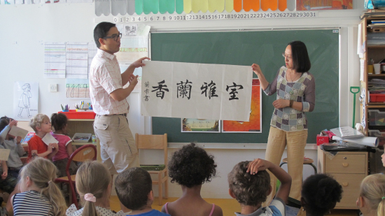 6月6日,阿尔萨斯孔子学院教师在中方院长赵宗红的带领下,走进圣约翰学校幼儿园部,为孩子们上了一堂汉字及书法体验课。老师跟孩子们一起玩汉字游戏,通过生动的游戏互动和图片展示,向孩子们解释了汉语语言的主要特点和汉字的演化过程。孔院的书法老师为孩子们揭开书法的神秘面纱,展示了文房四宝(笔、墨、纸、砚)和中国书法的正确握笔姿势。讲解一结束,孩子们就迫不及待地握着毛笔,开始尝试中国书法。