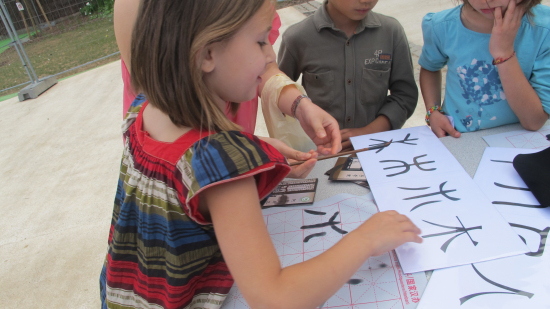 随后,在6月20日圣约翰学校小学部一年一度的家长开放日活动中,阿尔萨斯孔子学院应邀参加展示中国书法,并向小学生们开放书法体验。很多孩子排队学习用毛笔书写中国汉字。