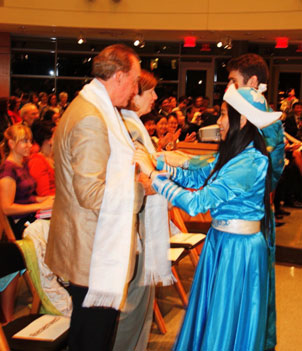 布莱恩特大学学生着内蒙古民族服装向嘉宾进献哈达