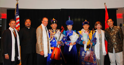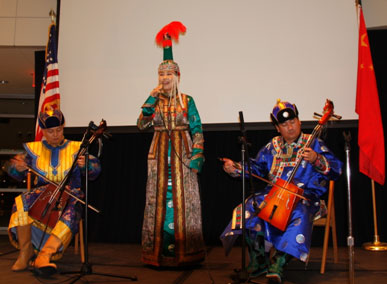 晚会的另一个亮点是由三位内蒙古民族歌舞团的艺术家带来的具有浓郁民族特色的长调、呼麦和马头琴表演。这三种音乐表现形式是草原音乐的经典,已被联合国教科文组织列为世界非物质文化遗产名录。三位演员身穿内蒙古民族服装,为观众表演了脍炙人口的内蒙古民族音乐。最后,演员们分别用呼麦和马头琴表演了两首家喻户晓的英文歌曲,《友谊地久天长》和《雪绒花》,给美国观众带来了阵阵惊喜。整场演出使观众沉浸在充满内蒙古的辽阔浓郁的草原氛围中,享受着一场听觉盛宴。当地罗德岛一个学区的代表演出后对演员们说,“谢谢你们带来这么美妙的音乐。真是太棒了!”。 布大科学与技术系的系主任Gaytha Langlois教授说,”我去过内蒙古,非常喜欢那里的人们和那里的音乐”。普罗维登斯幼儿园的老师Maria Curtin说,”我虽不懂蒙古族语言,但我非常喜欢今晚表演的蒙古族音乐”。 在布大任教的中国地质大学(武汉)的汉办教师感慨到, 就是在国内,要听到这么原汁原味的蒙古族音乐也不容易呀。