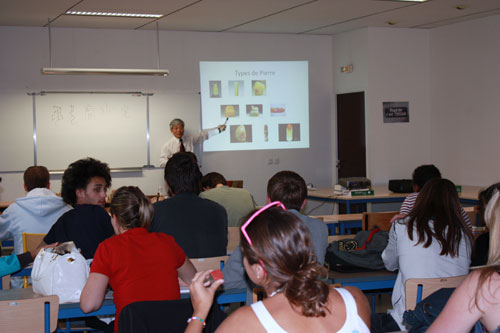 展览同时,孔子学院安排了刘老师做了三场有关中国印章篆刻艺术的讲座,在市政府国际文化中心一场,在拉罗谢尔大学二场,均受到拉罗谢尔市民众和大学师生们的热烈欢迎。刘老师从中国汉字起源解析中国汉字与篆刻艺术的渊源,到演示篆刻手法,以及让同学们用他带来的石料参与动手学习篆刻,不少同学亲自尝试了篆刻自己的名字,体验了篆刻艺术的魅力,更加深了对汉语和中国文化的喜爱。有意思的是一位中文系的学生篆刻了一个‘爱’字,并当众宣称要将这块篆刻好‘爱’字的印章送给他的女朋友。讲座结束后,在热烈的掌声中,同学们纷纷拥到讲台要求刘老师在自己的书上、笔记本上签名盖章留念。