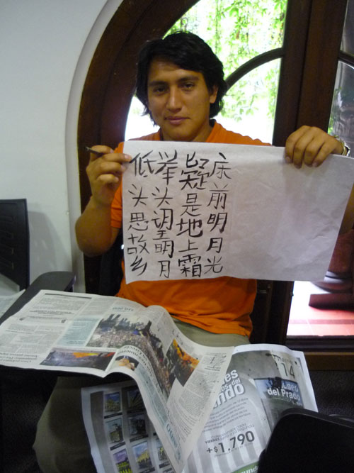 10月22日开设的第四次中国书法课再次取得了成功。许多听课的学生都曾学过汉语并对汉字和书法有一些了解。课上,16名学生边听中国民乐,边了学习书法的历史并欣赏了中国古代几位书法名家的作品。大家不但学习了理论知识,而且还有机会拿起毛笔练字,这是许多同学第一次练书法。