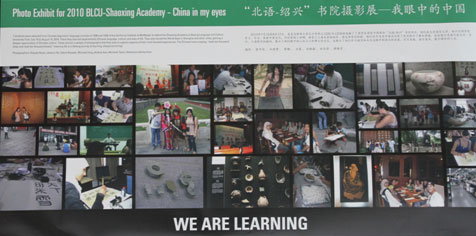 “我眼中的中国”摄影展在大学学生中心一楼大厅举行,参加展出的照片分为三个相互区分又紧密联系的主题:“悉心求学”“享受美食”和“人在旅途”。“悉心求学”主题收录项目参与者在中国学习汉语、学习中华文化技能的照片,他们或是在老师的带领下拿起毛笔,一笔一划地练习书法,或是近距离地观察传统乐器古筝,陶醉在美妙的中国古典乐曲中;“享受美食”主题的照片记录“绍兴书院”的学习者们在中国餐馆里享用地道、美味的中国菜的情景;“人在旅途”记录了学生们在北京、绍兴、上海观光游览的难忘经历。