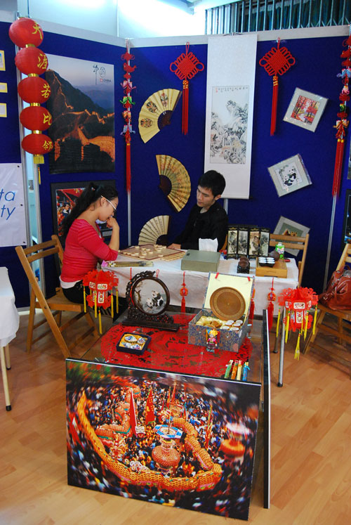 所谓“众人拾柴火焰高”,在活动现场最耀眼最热闹的便是中国展区。大红的灯笼高高挂起,淡雅清远的水墨画居中,两边的中国结与之相映衬,古香古色。展台上京剧脸谱图案的扇子,苏绣屏风,绢绸手帕,竹编酒壶,旗装旗服,青花瓷化妆盒……无一不展现中国特色。