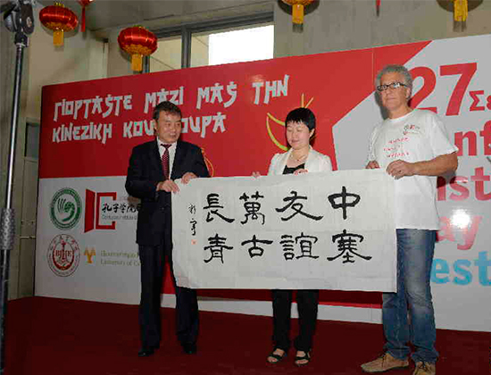 北京教育学院书法教师王新宇书写《中塞友谊万古长青》,左为大使刘昕生,右为塞大校长