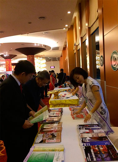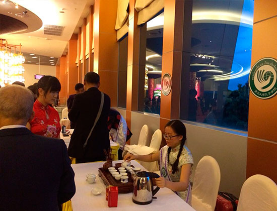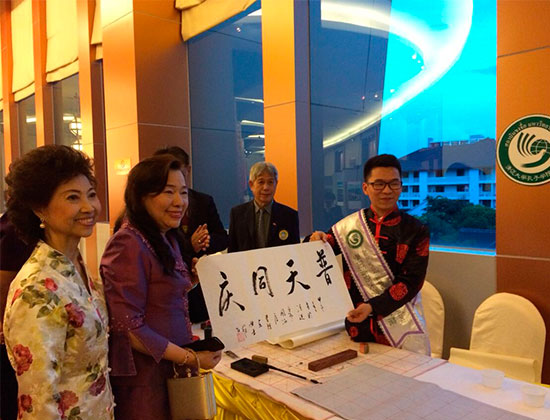 招待会开始前,清迈孔院的教师们为参加招待会的嘉宾展示了中国书法、茶艺、中国结等中国文化,还进行了一系列中国文化书籍的展览。出席当天活动的嘉宾除了泰国政界、商界的重要人士以外,还有很多年过古稀的老华人、华侨,当这些曾见证中泰两国关系的发展,推动两国关系前进的长者们看到书法、茶艺等中国文化元素时,他们非常激动,特别是书法展示,很多老华人、华侨一直站在书法展示台旁边投入地看志愿者老师书写,每写完一幅字,他们都要问写得是什么内容,什么内涵。展示最后,志愿者老师将书写的作品赠送给了各位华人、华侨。