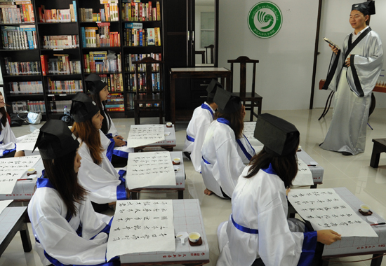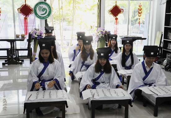 在此次清迈孔院的中华古风体验活动中,清迈孔院教师们不再只是专注于文化展示部分,而是将中华传统服饰、文化、礼俗等内容充分结合,在展示的基础上增加互动体验环节。何鹏老师穿起了古代的先生服,前来参加中华古风体验活动的学生们也都兴致勃勃地穿起了学生服,坐在书案前学着老师的样子手拿论语,投入地读了起来。读完论语,学生们开始在何老师的指导下认真地学起了书法,他们学得有模有样,仿佛真正做起了中国古代的书生。