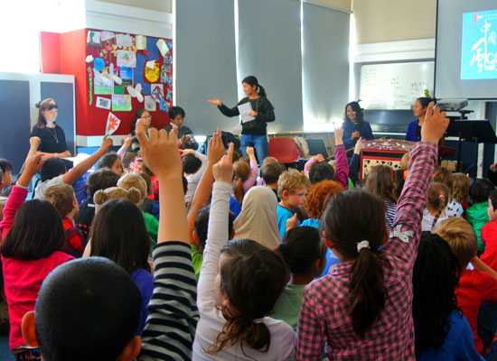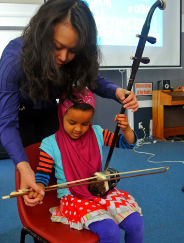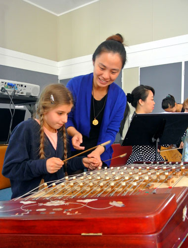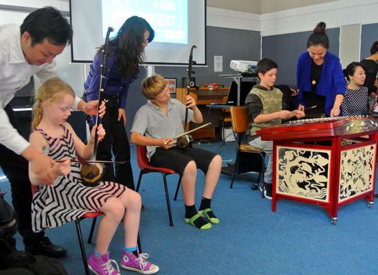 下哈特市的Ss peter and Paul 小学用优美的歌声迎接艺术团,Te Aro小学的学生代表用流利的汉语欢迎音乐家。在Kelbu Normal 小学,伴随着开场《喜庆江南》的声声丝竹乐,师生们仿佛进入了一片宁静而繁荣的江南水乡中。在Thodon小学,唢呐独奏《百鸟朝凤》活灵活现地模仿了十几种鸟鸣,孩子们笑的前仰后合,整个礼堂仿佛瞬间变成了森林中的百鸟园。在惠灵顿东方女子高中,琵琶独奏《彝族舞曲》,轻拢慢捻抹复挑,音乐画面中的彝族同胞手举火把,载歌载舞,学生们也伴随着曼妙的音乐轻摇慢摆。每场音乐会结束后,现场的互动气氛都十分高涨热烈,孩子们争先恐后地上台“演奏”,音乐家们也耐心的教授这些未来的“小音乐家”。