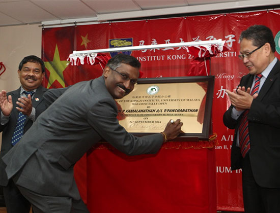 2014年9月26日上午,作为“全球孔子学院日”系列庆祝中的主要活动,马来亚大学孔子学院举行了新办公楼启动仪式。马来西亚教育部副部长柯玛拉那丹,中国驻马来西亚大使馆公使衔政务参赞马珈,马来亚大学校长拿督·阿闵教授,北京外国语大学党委副书记姜绪范参加了启动仪式,马来西亚教育部副部长柯玛拉那丹为马来亚大学孔子学院办公楼揭牌。