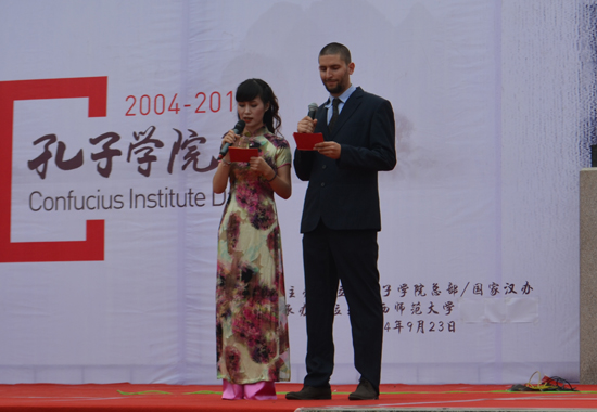 广西师范大学此次"孔子学院成立十周年"庆祝活动在承办单位各方人员的通力协作,精心准备下,于2014年9月23日下午在学校雁山校区孔子广场顺利开展。广西师范大学蔡昌卓副校长,国际文化教育学院相关领导以及一千多名中外师生参加了此次庆祝活动。