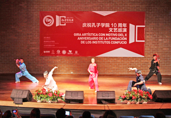 受孔子学院总部/国家汉办派遣,大连外国语大学演出团一行22人于10月4日至17日期间赴哥伦比亚、秘鲁两国举行"庆祝孔子学院10周年"文艺巡演活动。当地时间10月6日19时,巡演团的首场演出在哥伦比亚伊菲特大学礼堂正式开始,拉开了此次"庆祝孔子学院10周年" 文艺巡演的序幕。