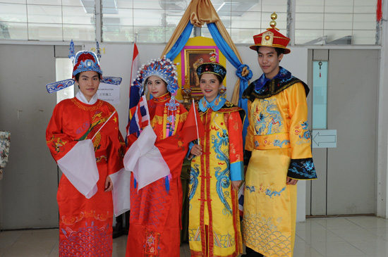 当天活动的第二部分--清迈大学孔子学院“孔子学院日”庆典活动开幕式于下午一点半拉开帷幕。嘉宾步入庆典区域即可看到大型舞狮、腰鼓和太极表演和各参赛学校学生设计的“中国元素”作品。在庆典活动的现场,清迈大学校董会主席KasemWattanachai教授亲切致辞回顾中泰两国文化至交并盛赞孔院在中泰两国友谊和文化交流中的积极作用。中华人民共和国驻清迈总领馆巢小良总领事为庆典活动亲切致开幕辞、并与嘉宾为清迈大学孔子学院“中国文化展示中心”揭牌,宣布清迈大学孔子学院“中国文化周”开幕。在现场嘉宾和师生的见证下,清迈大学孔子学院“中国文化展示中心”正式揭开其神秘面纱,并将致力于为泰北地区热爱中国文化的各界人士和师生提供一个学习交流的平台。