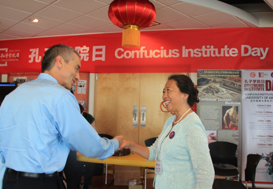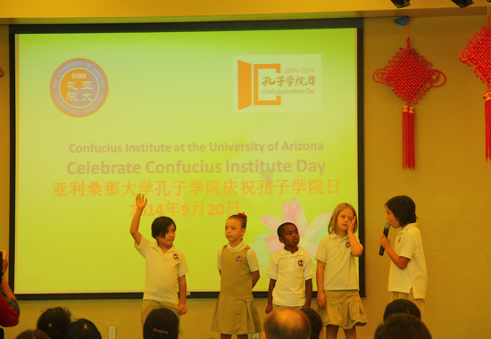 亚大孔院的这次系列文化节活动从九月二十日开始,持续八天。 九月二十号,图桑市中国文化中心张灯结彩,热闹非凡,亚大孔院"第三届中国文化节暨庆祝孔子学院成立十周年",亲历中国文化系列活动首先拉开了序幕。从上午九点开始,一直持续到下午三点。来自图桑中小学的八百多名师生、家长和社区人员都已参与到丰富多彩的文化活动中。大厅内,亚大孔院庆祝孔院日的书法展与摄影展吸引着人们驻足观看;来自中国音乐学院和中山大学的孔院教师演奏的二胡、古筝、笛子、大、小阮等民族器乐也让图桑人们耳目一新。九点一到,汉语知识竞赛率先拉开了序幕。只见台上竞相抢答,台下掌声阵阵;再看篮球场上,"跟我学中华武术"、"跟我学中国民间舞"、"跟我学中国民乐"、"跟我学书法、国画"等区域前更是汇集了不少跃跃欲试的学生和家长;教室里,"跟我学汉语"的汉语学习体验课也异常活跃,一个个金发碧眼的孩子们争相恐后地回答问题;中国文化展台、中医养生保健展台、亚大孔院课程及项目介绍的展台前,前来咨询的人也流络绎不绝……此外,中国传统的踢毽子、抖空竹、滚铁环、跳皮筋、编中国结、画脸谱、剪纸等游戏让图桑人民着实过足了中国文化体验瘾。图桑市市长Jonathan Rothschild亲临现场并发表了热情洋溢的讲话,盛赞亚大孔院为图桑人民分享中国文化所做出的努力与贡献;并给中文短剧比赛、书法及摄影比赛获奖的学生和团体颁奖。