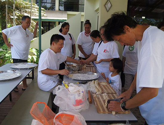开幕式后,学生们在太极教练的带领下,兴致勃勃地打起了太极拳,接着在图书馆里欣赏了优秀学生的作品展。随后,大家开始了这一天主要的活动——包团圆饺子。跟着老师,擀饺子皮,包饺子,煮饺子,学生们兴致勃勃、乐在其中。当了解到中国人一起包饺子寓意团圆时,学生们表示,“我们孔院师生就是一家人,我们一起包饺子,团团圆圆,共庆佳节”。也有学生表示“我是出生在斐济的中国人,但却没有任何时候比今天更能理解中国,我觉得我现在更像一个中国人了。”
