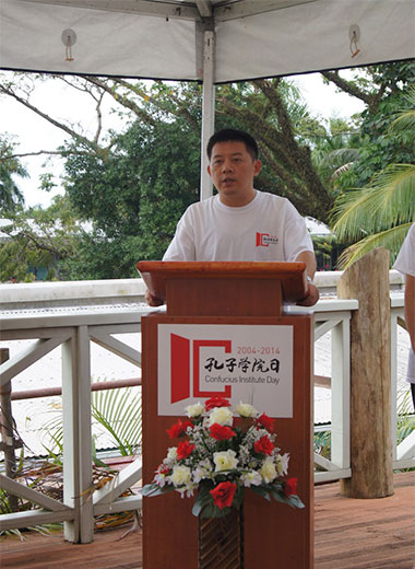 李登贵老师简单回顾了孔子学院十年来的发展历程以及南太孔院近三年的发展情况。随后,杨朝晖参赞在致辞中简要阐述了孔子思想对中国和世界的重要影响以及孔子学院对世界的重要意义,积极评价了南太孔院为推广汉语教学和传播中国文化所做的努力。院长余倩莊在最后的讲话中,首先向孔院十周年表示祝贺。对孔院总部、北京邮电大学以及中国驻斐济大使馆对南太孔院的发展给予的支持和帮助表示感谢,对三年来南太孔院所取得的成绩表示满意。南太大学文法教育学院院长阿卡尼西也在百忙之中赶到活动现场,代表学校向孔院十周年表示祝贺。