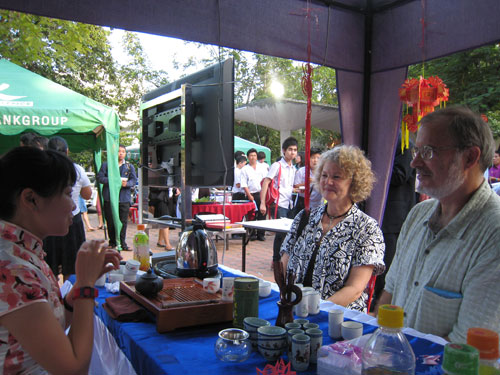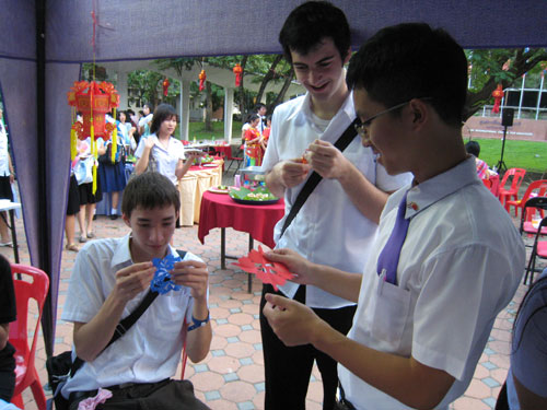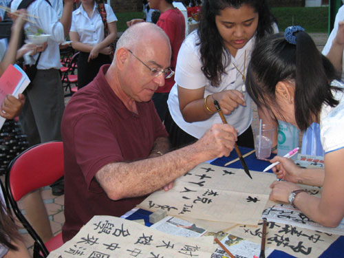 清迈大学孔子学院在“中国日”活动中表现抢眼,并为活动的成功举办发挥了重要作用。我们设计了内容丰富的中国文化展台,除了传统的剪纸、书法、茶艺以外,还用中国文化体验设备循环播放关于中国的介绍片。现场还提供了饺子、汤圆等典型的中国食品,大批学生在体验中国传统文化的同时品尝中国食品,既饱眼福又饱口福。毛笔书法是中国传统文化的主要内容,现场观众兴致勃勃的学写书法,其中不仅有学习汉语的学生也有对汉字和中国书法感兴趣的西方学者。茶艺展位前一批又一批的师生来轮番观看茶艺师的表演,此时饮茶不是主要目的,茶的冲泡操作过程才是他们的兴趣所在。剪纸展位前学生们饶有兴趣的在老师的指导下剪出不同图案,看到自己的作品,学生情不自禁的流露出开心的微笑。观众直到夕阳西下华灯初上才依依不舍的离去,活动取得了圆满成功。(作者:马维薇)