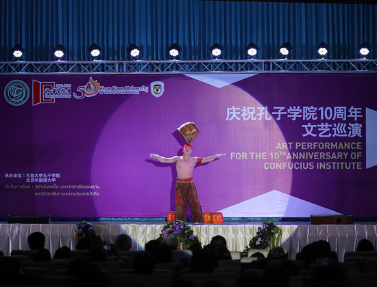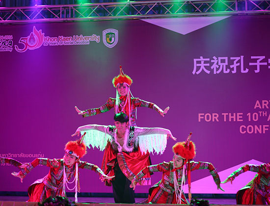 2014年10月4日晚,由国家汉办主办,孔敬大学孔子学院承办的庆祝孔子学院成立10周年泰国孔敬大学站文艺巡演在孔敬大学兽医学院大礼堂拉开帷幕,中华人民共和国驻孔敬府领事馆总领事谢福根先生、孔敬大学副校长塔瓦旺先生、孔敬大学孔子学院中方院长王贵彬先生、孔敬大学孔子学院泰方院长姚婉娜女士、北京外国语大学巡演团代表教师及孔敬大学多所学院院长和泰东北地区多所学校的校长出席了本场晚会,来自孔敬大学各学院和泰东北地区的相关汉语教师以及来自泰东北地区的多所大学及中学的300多人到场观演。谢福根总领事为本次晚会致开幕词,塔瓦旺副校长为本次晚会致欢迎辞,随后北京外国语大学演出团和孔敬大学孔子学院互赠礼物。