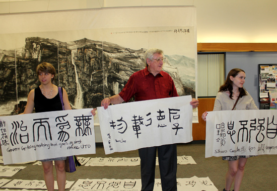 在观众欣赏大型书画展览的同时,孔子学院中方院长张乾元教授开始现场泼墨,进行现场书画演示,几十名学生参加学习和互动,接着开始了一场生动有趣的书法比赛。十多位学生临摹书写了“厚德载物”、“自强不息”、“无为而治”等难度较高的篆隶作品,他们虽然是初学中国书法,但章法布局错落有致,且有一定的创新意识。经评委认真评选,最后获得一等奖的3名,二等奖的5名,三等奖若干名,最大年龄81岁,最小年龄9岁。获一等奖的作品将参加在北京孔子学院总部举行的全球孔子学院书法比赛。