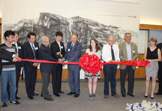 剪彩仪式由克莱茨院长主持,威登绍副校长、赵玉敏副总领事、分别致辞,祝贺全球首个“孔子学院日”隆重举行,并从不同的角度高度肯定了孔子学院在教授汉语语言、传播中国文化、促进中美人民的友谊所做的贡献,高度赞扬了UTD孔子学院在七年来在教学、科研、艺术交流、社区文化活动等的所取得的成就,孔子学院美方院长顾明东教授感谢UTD 及达拉斯各界对孔子学院的热情鼓励和支持,以及孔子学院及下设十几所孔子课堂的教师们的辛勤劳动。最后,在中国民音的悠扬乐曲声和全场嘉宾热烈的掌声中,威登绍副校长和赵玉敏副总领事为庆典剪彩。庆典结束后,嘉宾们参观了中国书画作品展。