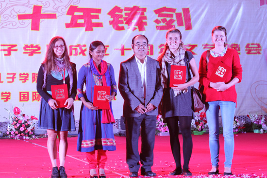 2014年9月27日晚,云南师范大学东区贝壳广场座无虚席,近千多名中外学生欢聚一堂, 短片《孔院十年》拉开了“春风化雨,十年铸剑——云南师范大学庆祝孔子学院成立十周年文艺晚会”的序幕。云南师范大学校长助理、国际汉语教育学院院长武友德教授、国际汉语教育学院党委副书记沈毅及中外师生参加了本次活动。