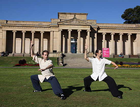 谢大孔院武术教师Jeff(左)和Pablo(右)在Weston Park博物馆门前表演武术