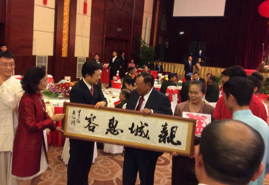 关华兵大使将两位老师的作品,体现我国周边外交工作四字方针的书法作品《亲城惠容》和中国传统文化的剪纸作品《福》现场赠送给老挝国家副主席本扬•沃拉吉和夫人。