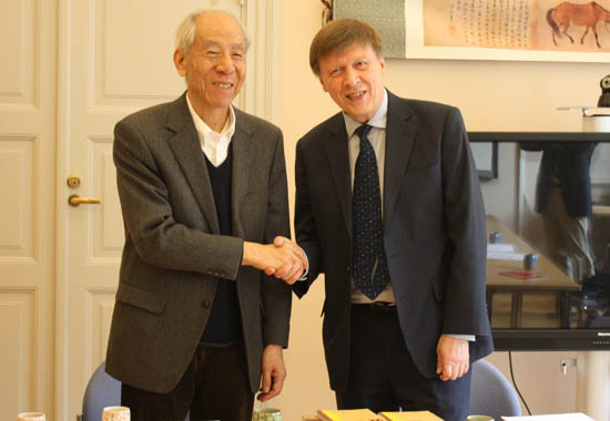 作为“孔院日”系列文化活动之一,当地时间9月23日下午,中央文史研究馆代表团来到赫尔辛基大学孔子学院参观访问,并做专题文化讲座。代表团由中央文史研究馆馆长袁行霈先生带队,由中央文史研究馆馆员、中央美术学院教授金鸿钧先生,中央文史研究馆馆员、敦煌研究院院长樊锦诗女士,国务院参事室交流合作司司长蒋勤女士,国务院参事室文史业务司处长吴著友先生等组成。