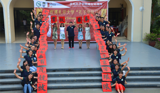 值此孔子学院成立十周年之际,红溪礼示大学孔子学院志愿者教师共“书”心中美好祝愿,祝福我们挚爱的孔子学院十周岁生日快乐!
