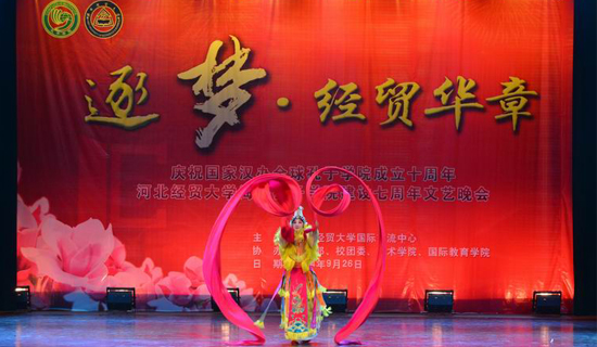 为庆祝全球孔子学院成立十周年,配合国家汉办/孔子学院总部的“孔子学院日”活动,9月26日晚,河北经贸大学以“逐梦•经贸华章”为主题举办文艺晚会,展示了该校合作的两所海外孔子学院的发展历程和辉煌成就。