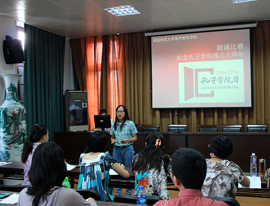 活动在“图片展”中拉开帷幕,图片展详细介绍了“孔子学院”成立、发展历程和所取得的成就,加深了留学生们对“孔子学院”的认识。当天上午还举行了“朗诵大赛”,共有17位留学生参加。海外教育学院林新年院长担任比赛的指导老师,陈晟、林琳琳、蔡建丰、黄彬等五位老师担任比赛的评委。选手参赛篇目贯通古今,内容丰富,朗诵时颇具情感,赢得阵阵掌声。最后来自印尼的陈美启同学、斐安娜同学和来自菲律宾的罗德丽同学分别获得了此次朗诵比赛的冠亚季军。朗诵比赛不仅能够提高留学生们的口语能力,而且通过朗诵表达了他们对孔子学院的情感,并且加深了他们对中华文化的理解。