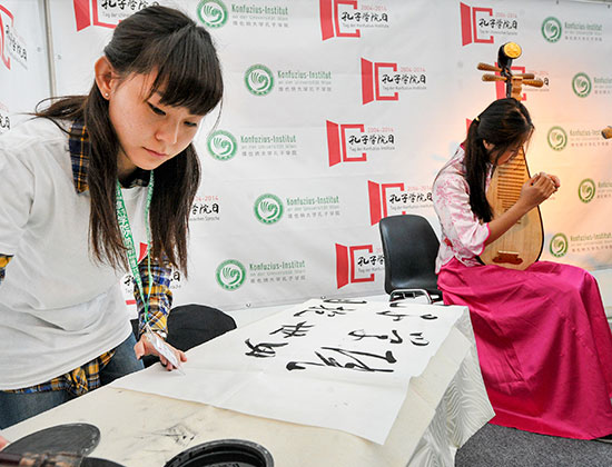 在举办孔子学院日的帐篷里,各个展位的活动丰富多彩,妙趣横生。在茶艺区,不仅能欣赏精湛的茶艺表演,还能亲自品尝清香扑鼻的乌龙茶、绿茶与普洱;在汉语体验课上,每个人都可以学到汉语基本知识以及简单到问候用语如“你好”、“谢谢”、“再见”,还能参加有趣的“汉字连连看”游戏,发现中国象形文字的奥妙;在中医体验区,前来咨询的市民排起了长队,特邀嘉宾杨医生认真地为大家号脉、诊断,恳切地给出针对每个人疗病养生的建议;在手工区,维也纳市民兴趣盎然地跟着孔院志愿者学习中国结与剪纸,不到五分钟便拿着各自的作品满意离去;在中国传统艺人的展区,前来参加活动的人们在色彩斑斓、各式各样的马勺与手工艺品前流连忘返。最受欢迎的还要数书法体验区,在这里每个人都可以得到自己的中文名字,还能得到用毛笔写成的中国名字留作纪念。志愿者钱一菁说:“我给差不多给上千人写了中文名字,有写给躺在床上老伴儿的、写给7天大的小宝宝的,还有写给妻子的我爱你,写给岳母的生日快乐。”大家用中文表达着对亲人,对家庭的爱。