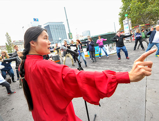 上午十一点左右,悠悠乐音响起,一袭红衣的太极师傅刘永丽舞起太极功夫扇,过往市民纷纷驻足观看表演,全场活动达到了高潮。表演结束后,刘老师带着志愿者向周围的维也纳市民们传授中国传统的养生知识,以及简单实用的按摩保健技巧,观众们兴致勃勃地参与其中,手舞足蹈跟随着刘老师的动作学习按摩保健的方法。