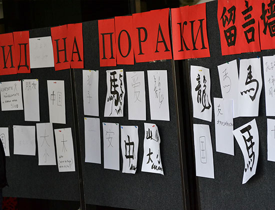 本次系列文化活动,书法展示与体验课和留言墙吸引了大家的目光。中方院长邓时忠教授在连续几天的活动中现场挥毫泼墨,表演了中国传统艺术的瑰宝——书法。只见他的身后悬挂着几幅中国古典山水字画,桌前摆放着笔墨纸砚。马其顿学生和民众在虽简单却典雅精致的环境中感受着中国书法的魅力。他们纷纷上前感受写毛笔字的新奇和快乐。前来索要书法的人络绎不绝,排起了长长的队伍。书法体验课共开了13个班次,应学生家长要求,于孔子学院日当天下午又专门为少儿书法爱好者开了一个大型书法课堂。