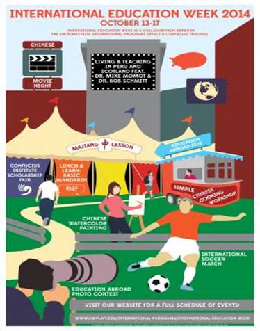 美国威斯康星州普拉特维尔大学孔子学院继举办孔子学院日文化活动周(9月22-26日)之后,在美方院长Mei Reeder和办公室经理Tricia Reuter的精心策划下,与国际学生服务中心联合举办了2014年国际教育周(Inteational Education Week,10月13-17日)的系列文化活动。