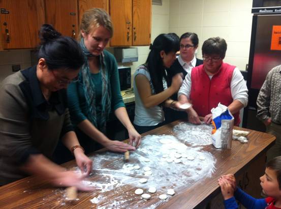 10月13日的烹饪课(Simple Chinese Cooking)吸引了20余人的到来,两个家庭驱车110公里从威斯康星州首府麦迪逊赶来,研究生助理Amanda Schroeder站在风雨中欢迎客人。孔子学院中方院长余承法博士和该校人文教育学院的访问学者徐晓强(吉林省教育厅基础处副处长)负责展示包饺子,中方教师张昆群和郝然讲授和指导煮饭、炒菜。在两个多小时的寓教于乐中,参与者既学会了做简单的中国饭菜,又享受了地道可口的佳肴,还加深了彼此了解。
