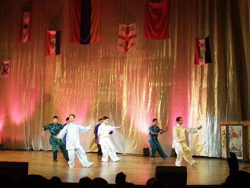 许多在亚东方国家的师生以及学习东方语言的亚学生参加了演出.亚美尼亚孔子学院的师生早在9月初即开始为此次义演排练节目,整场演出丰富多彩,涵盖了亚美尼亚、印度、韩国、伊朗、叙利亚、格鲁吉亚以及日本的歌舞表演,亚美尼亚孔子学院学生表演了中国传统歌舞《可爱的一朵玫瑰花》、《掀起你的盖头来》以及中国武术:太极拳、太极推手、剑术、刀术、棍术等,其中,孔子学院中国武术教授毛明春带领亚美尼亚学生表演的中国武术,精彩纷呈、气势磅礴,获得了全场一致的热烈欢迎,掌声不断。演出结束,大家纷纷向中国武术教授表示祝贺,祝贺他们的演出是全场最受欢迎的节目。