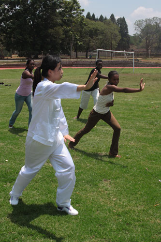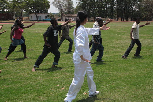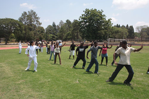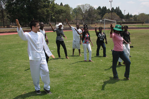 津巴布韦大学孔子学院的中文课程中,包含文化课这一项目,聂祖国和马艳超两位教师志愿者到这儿以后,向同学们教授太极,深受欢迎。学生们有的是来自津大汉语专业的学生,也有专程过来“偷师”的社会学员。