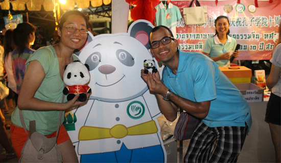 其中一位会说一口中文的美国人GUS,学了中国结,又学了剪纸,更幸运地抽奖抽到了一只大熊猫,兴奋地跟手捧莲花灯的熊猫合着影。他说他曾在美国的大学学过两年中文,在泰国看到孔子学院感到格外亲切。一幅景,多国民众,其乐融融,如那手捧莲花灯的熊猫展板,笑意盈盈地“诉说”着中泰两国人民的美好情谊。