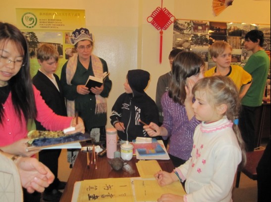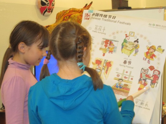 2010年11月14日,俄罗斯新西伯利亚市五一区儿童图书馆内一片欢声笑语,正在举办的俄罗斯新西伯利亚国立大学孔子课堂“认识中国”儿童文化节吸引了众多的家长和孩子。展厅的一面陈列着有关中国文化历史的俄文书,另外有专柜摆放汉办推荐的儿童汉语教材。不大的展厅布置得极富中国韵味:大红的灯笼、中国结,惟妙惟肖的京剧脸谱,一字排开的中国书画,几十张由外国留学生拍摄的旅游照片,则展现了中国的现代化气息。此次展览的目的,就是在立足大学汉语教学的同时,积极在中小学推广汉语,让更多的俄罗斯民众了解中国文化,培养学习汉语的兴趣。