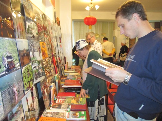 下午三点,书展正式开始,首先新西伯利亚市五一区儿童图书馆馆长Oparina Nina (奥帕莉娜.尼娜)表示对书展的支持和欢迎。主持人新西伯利亚国立大学孔子课堂外方负责人之一尤利娅老师利用孔子课堂“中国文化体验中心” 多媒体软件“功夫与书法”向家长和孩子们介绍了中国的概况和文化,随后中方教师和学员演唱的中国民歌。