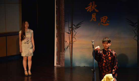 随后,学生们吟唱了《江城子》、《短歌行》、《月夜忆舍弟》、《水调歌头》、《将进酒》、《静夜思》等六首分别表现秋、月、思主题的中国经典诗篇。他们身穿中国传统服饰,化身诗人,沉稳有力、饱含情感地吟唱诗中情绪,为观众们奉上了一场充满诗情画意和浓郁中国文化韵味的视听盛宴,赢得了观众们的阵阵掌声和欢呼声。