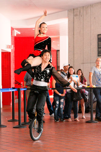 室外表演异彩纷呈,广场上挤满了学生和老师。来自中国的杂技演员表演了惊险刺激的旋转呼啦圈、球技、车技、以及川剧绝活——变脸,看得在场师生惊叹连连、掌声阵阵。当地华人协会为此次活动精心准备的中国民族舞蹈《俏花旦》和《青藏高原》也深深地折服了现场观众。她们每次跳舞之前都向学生介绍跟舞蹈内容相关的文化知识,以便让学生学生更好地理解舞蹈中的中华文化。汉语教师杨文胜身着蒙古民族服饰,现场高歌的《蒙古人》把观众带到了那辽阔的中国内蒙古草原。此次活动还吸引了美国的中国功夫爱好者,他们毛遂自荐表演了太极拳,以通俗易懂的语言向学生讲解了其中蕴含的中国哲学思想。节目的高潮是美国学生身着美轮美奂的中国民族服装走上T台,所有的观众起立鼓掌,并在活动后纷纷与学生模特合影留念。