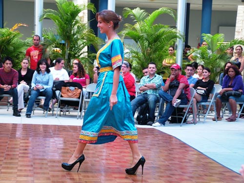 身着中国民族服装的学生模特走台步