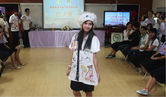 总决赛当天的走秀环节中,参赛选手们穿着自己设计的手绘T恤,向评委和观众们展示作品,曼松德孔院瞬间成为时装秀场,观众们赞叹不已。接下来是介绍环节,参赛选手介绍他们设计灵感的来源。传统舞狮、龙之图腾、历史古迹、现代建筑等等,中国元素成为一件件T恤上的设计符号。选手们还精心准备了PPT及简短视频,呈现他们的创作过程。一年级Nithima Khotbandit的作品上只有疏疏几抹黑色,却将一只可爱的熊猫呈现出来,极具中国国画的神韵,这件作品获得三等奖;主题为《中泰一家亲》的作品以其精美的画面与丰富的内涵斩获一等奖。