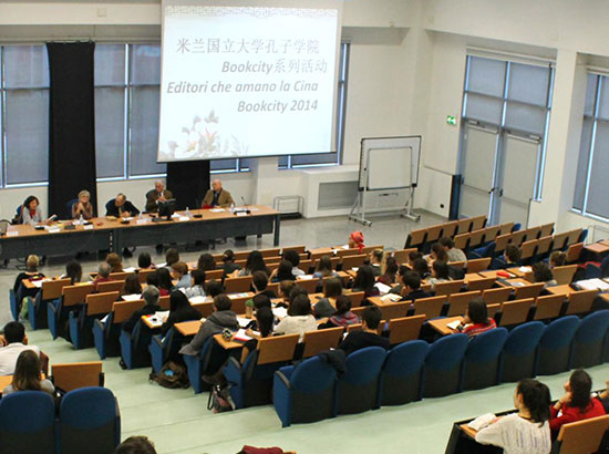 首先进行的是“热爱中国的出版社”座谈会,共有来自意大利的五个著名出版社代表介绍了他们出版的有关中国文化、文学和汉语方面书籍,并分析了中国书籍的市场与中国读者的特点。米兰国立大学部分师生、孔院学员及当地市民200多人参加了此次报告会。