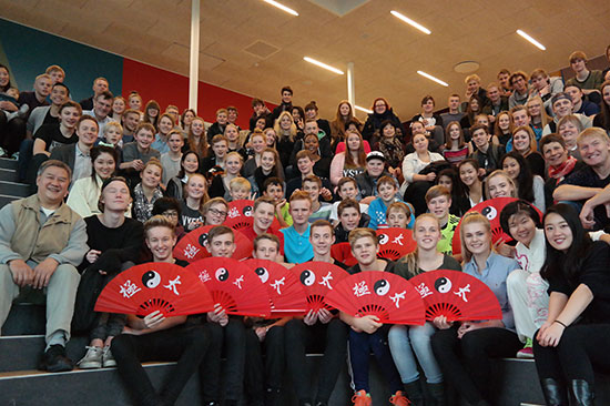 在接下来的工作坊中,近百名丹麦学生分成四组参与中国武术、音乐、书法和茶艺工作坊,近距离体验中国文化的美妙。书法家张志远先生挥毫泼墨,耐心指导学生握笔姿势,一起书写“丹麦,中国”等字,学生们对神奇的方块字惊叹不已;另一边古筝工作坊也是,学生纷纷上前尝试弹奏中国名曲《茉莉花》;与此同时,茶艺表演与古筝音乐丝丝入扣,志愿者教师张袁正在介绍中国茶文化和展示茶艺过程,学生们在品茶中体会和分享中国茶文化;在一块开放的场地上,中国武术更是博得了学生们的眼球,在单正午的指导下,学生们很快学会了基本套路,比划的有模有样。最后,三个多小时的中国日活动在欢乐愉快气氛中拉下帷幕。
